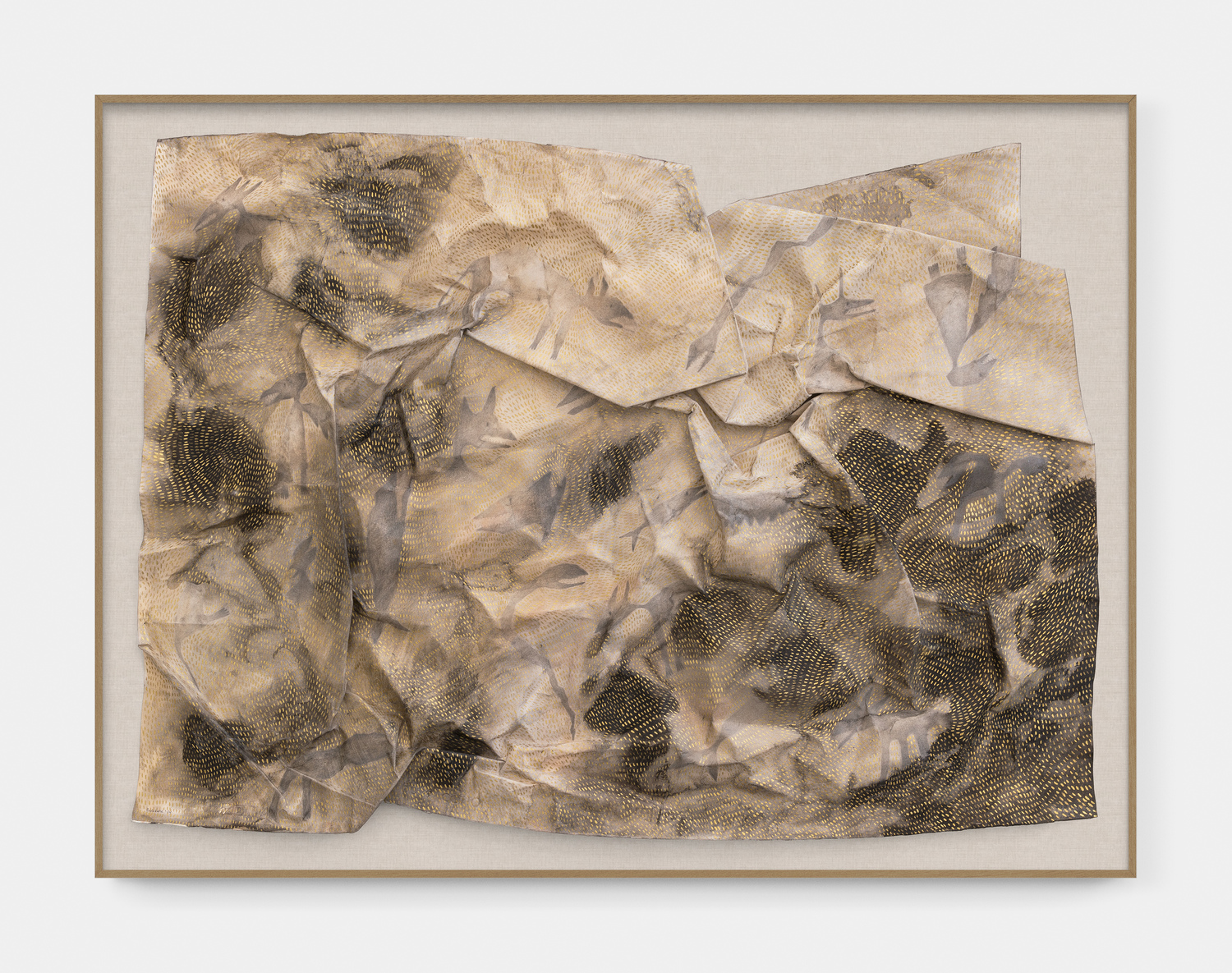 For the last few bodies of work, such as in her solo exhibition Things That Are My Own at EBONY/CURATED, her process has involved a multilayered approach to “treating” paper that begins with washing over it with acrylic paint, applied in a liquid, almost dripping state, and crumpling it into a bundle. Once unfolded, the paper becomes her working surface, transformed by the crumpling process into something resembling a rock or some other kind of precious metal. This technique - a method and metaphor - speaks of unfolding fantasies, dreams, and ideas that make up her practice. The paper retains the memory of what has been inflicted on it, but in that process transforms into a new kind of potentiality. I can’t help but think of this alongside the complex geological processes that result in rock formations over millennia, contained in singular objects that seem to carry the heavy weight of deep time. Her work, too, seems to carry the weight of history, whether it is in depictions of wild and fantastical animals or human figures that morph into each other, or lines and dots that form themselves into geometry.