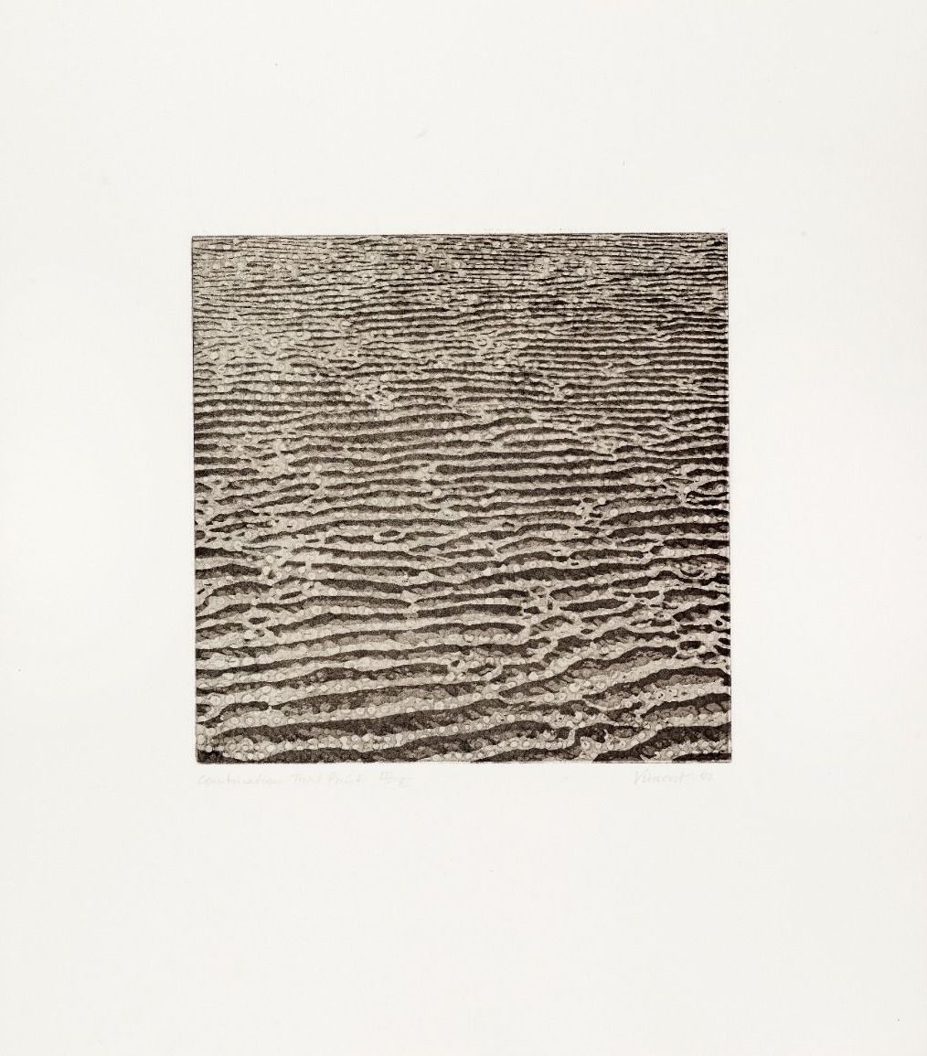 In this exhibition of eight prints and four paintings by Vincent and four sculptures in wood by Armstrong, the artists’ works exist in dialogue with each other, their rock garden landscape and their profound exploration of natural phenomena.