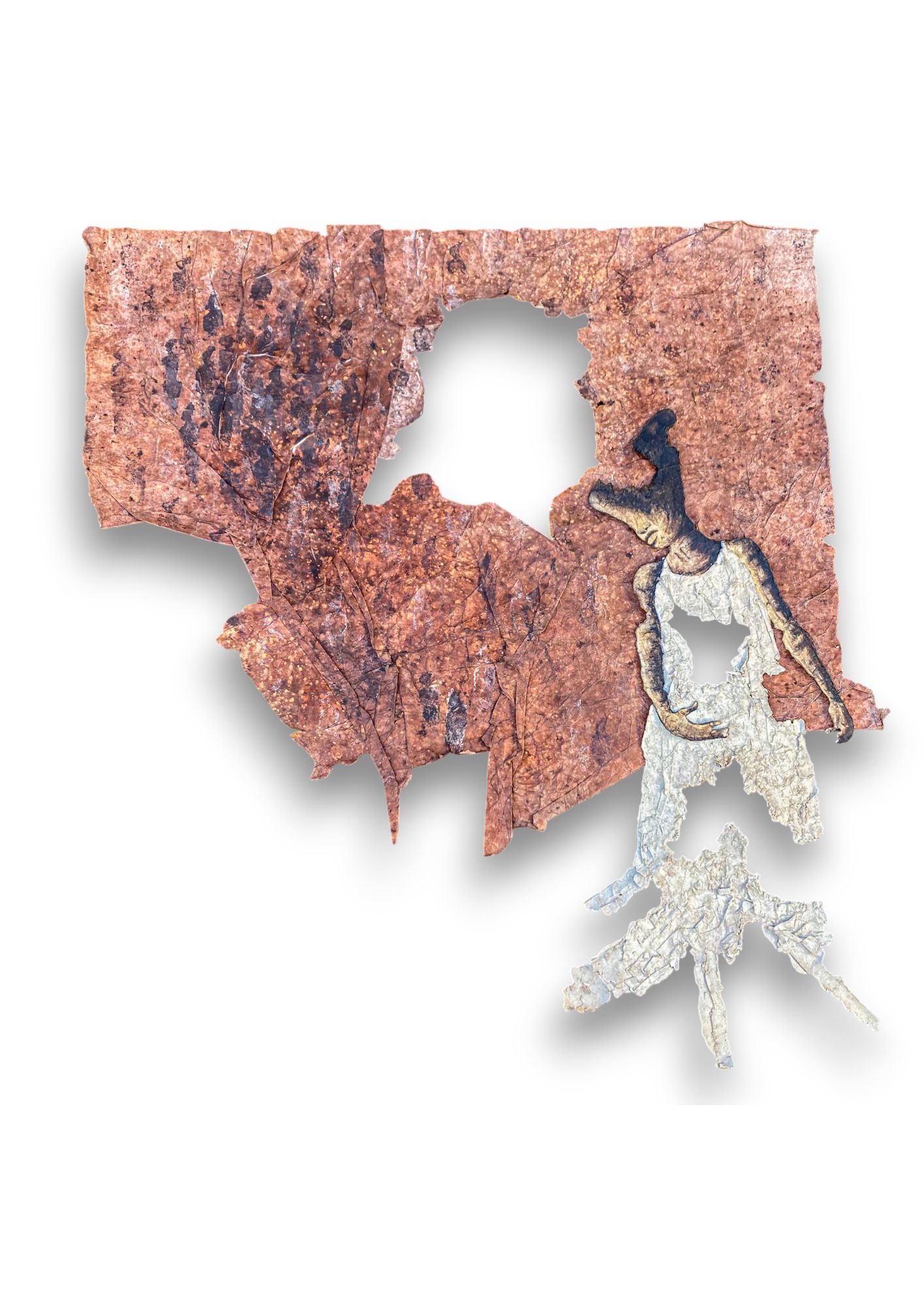 The journey begins with Olivia Babel, whose handwoven sculptures centre on territory, identity, and cultural hybridity. Working with natural wool, golden fabrics, and cotton thread, she maps geography, memory, and the body through fibre. Each woven form becomes a landscape of remembrance, grounding the exhibition in connection and continuity.