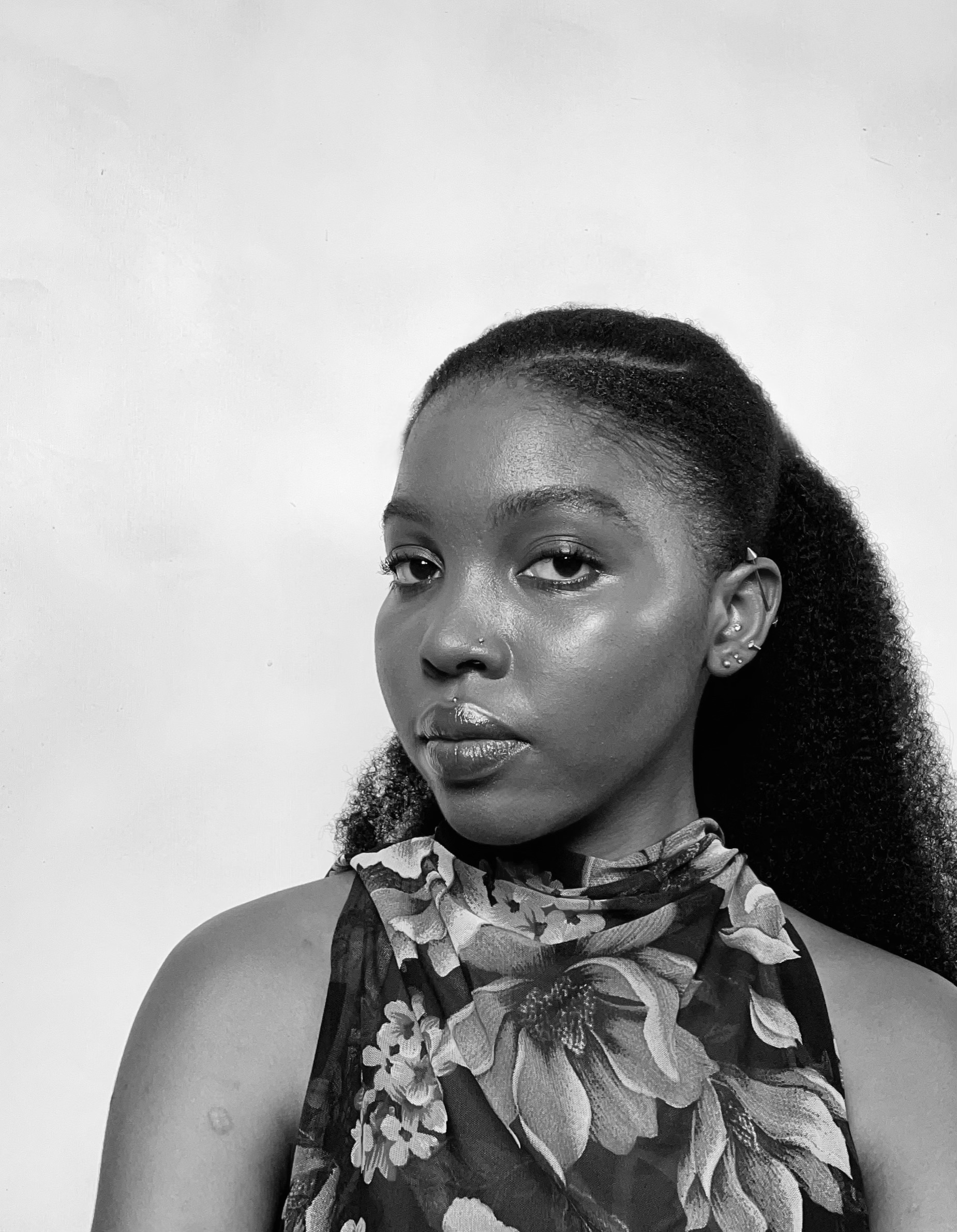 Lawrence Meju, She Measures the Hours in Petals, 2025, 35 by 23 inches.