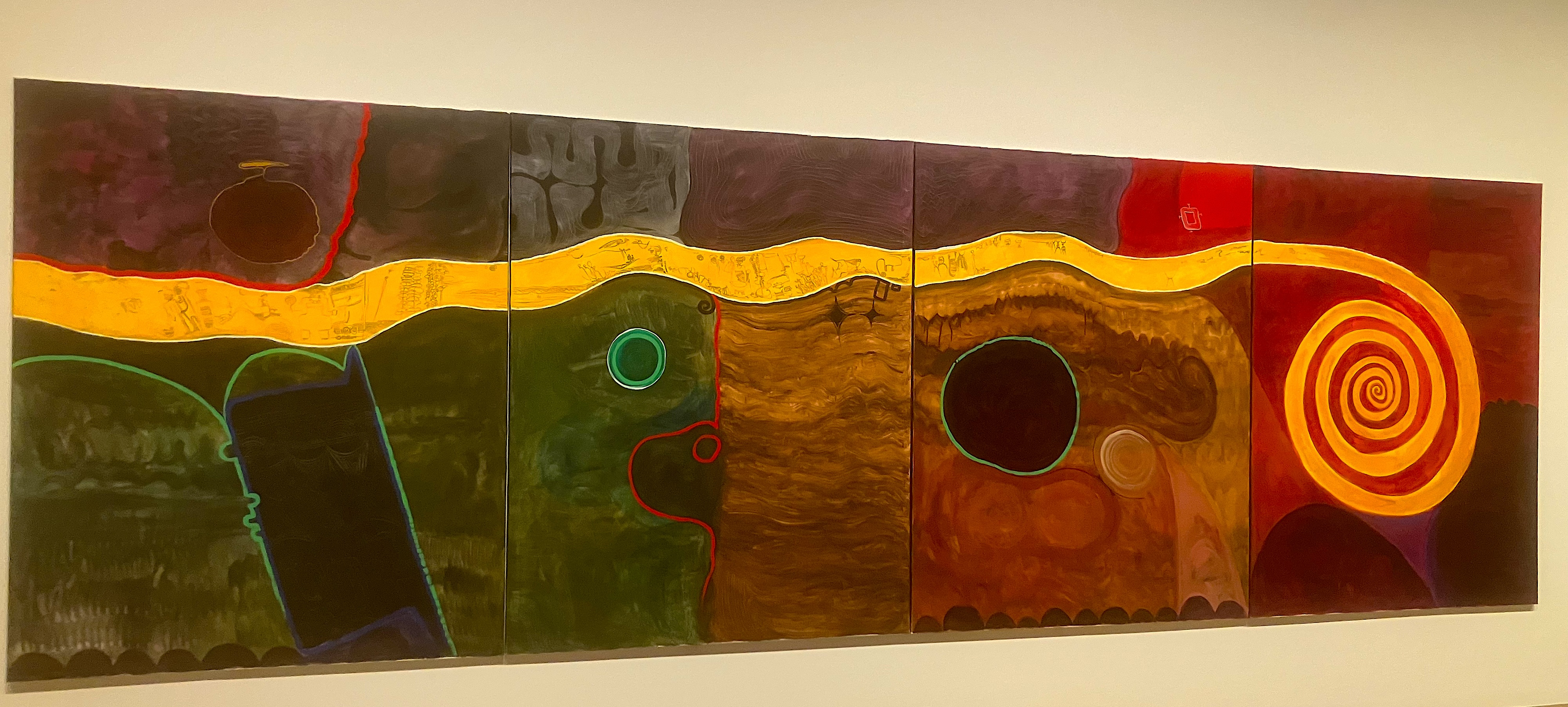 Earthy tones, complemented by abstract shapes in red and yellow, define another striking work in the exhibition: Obiora Udechukwu’s Our Journey (1990s). It presents the unfurling of a yellow ball containing figures and abstract forms, hinting at the unravelling of time or history, in much the same way this exhibition seeks to do. Produced in the 1990s, the work signals, so to speak, the endpoint of the ideological thread that shaped Nigerian visual expression. The legacy of these various modernisms could have been more fully unpacked; concluding the exhibition with a solo presentation of Egonu’s synthesis of abstraction and figuration feels like an unsatisfactory ending.