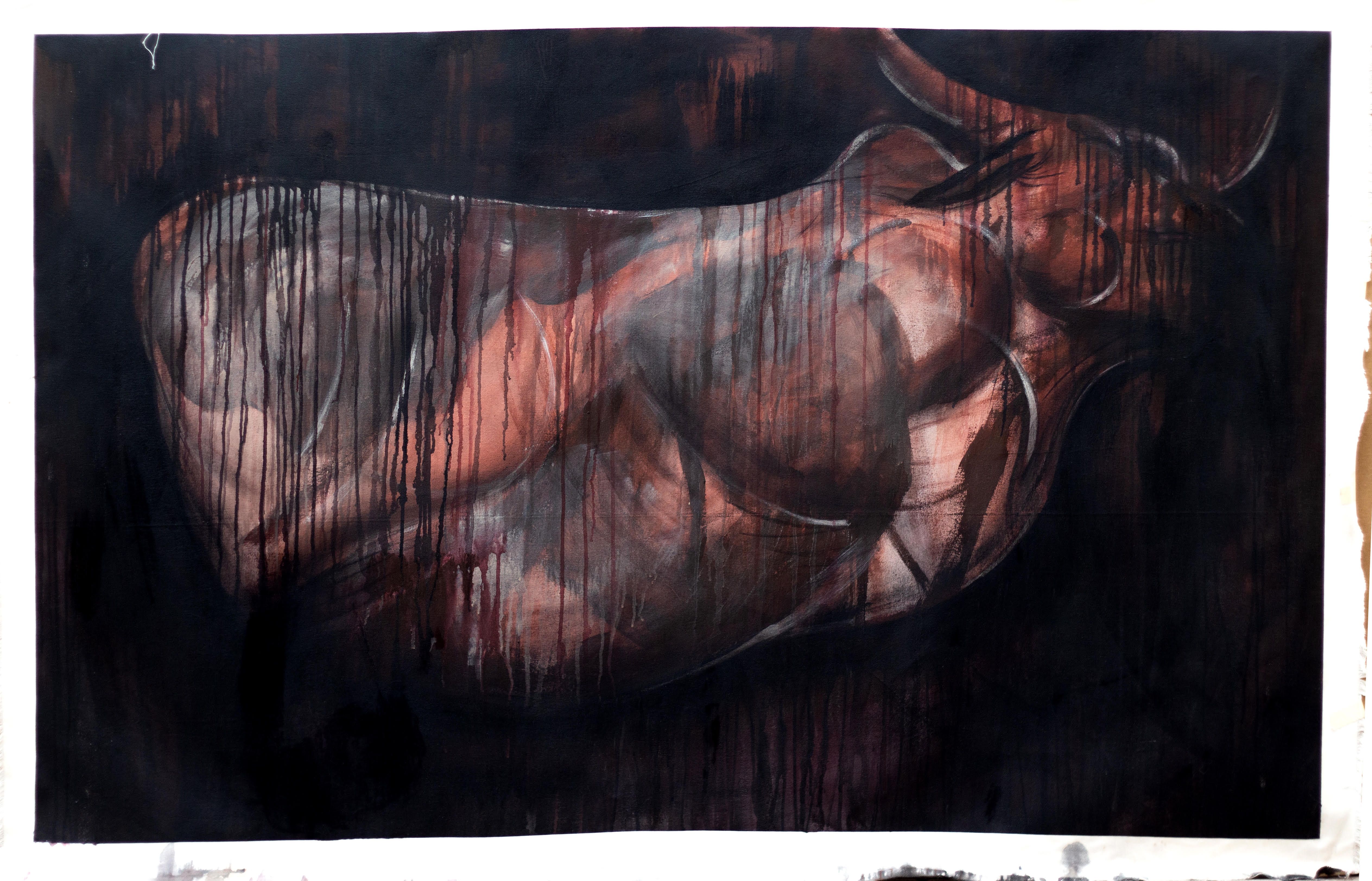 In the image, the animal hovers between life and death, its body rendered without limbs — a gesture toward its utter helplessness, its absolute submission to fate. The paint bleeds downward in long, unrelenting drips — black, red, and crimson — echoing tears, blood, and rain. These drips are not decoration; they are grief made physical. They speak of anguish, frustration, helplessness, and rage. They weep for what has been lost and scream for what remains. The animal is a body undone, weeping not just for itself, but for what it represents — the violence of being, the inevitability of loss, the dignity in sacrifice.