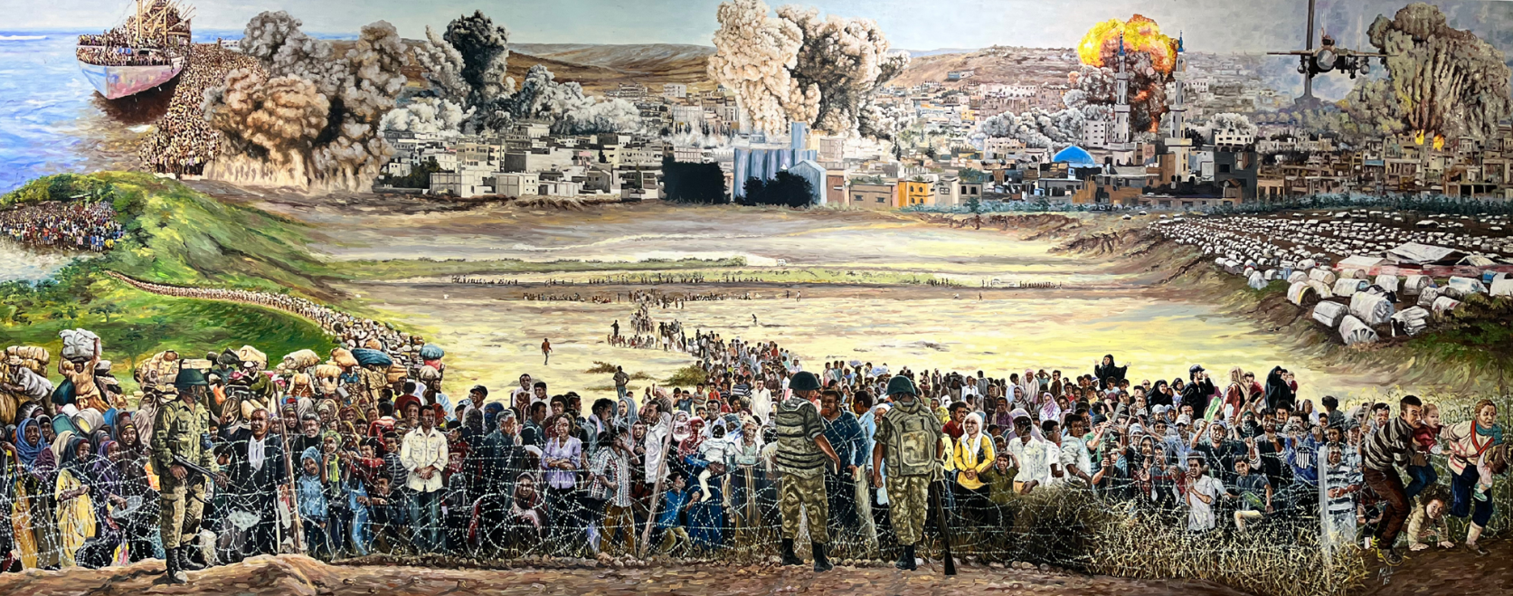 This space was intended to be filled by an artwork representing a hundred or more individuals on a journey of their own, a testament to the enduring nature of human determination — an artwork by Vita Malulu entitled Peace. Peace depicts a large group of people making a journey from a war torn area through a plain of destruction, searching for safety. The people depicted come to an impasse: a barbed wire fence guarded by soldiers. In the background fighter planes drop bombs on a destroyed city, and a refugee camp sits nestled between the conflict. Perhaps as further testament to the uniting African quality of tenacity, the titling of Peace stands in contrast to what it depicts.