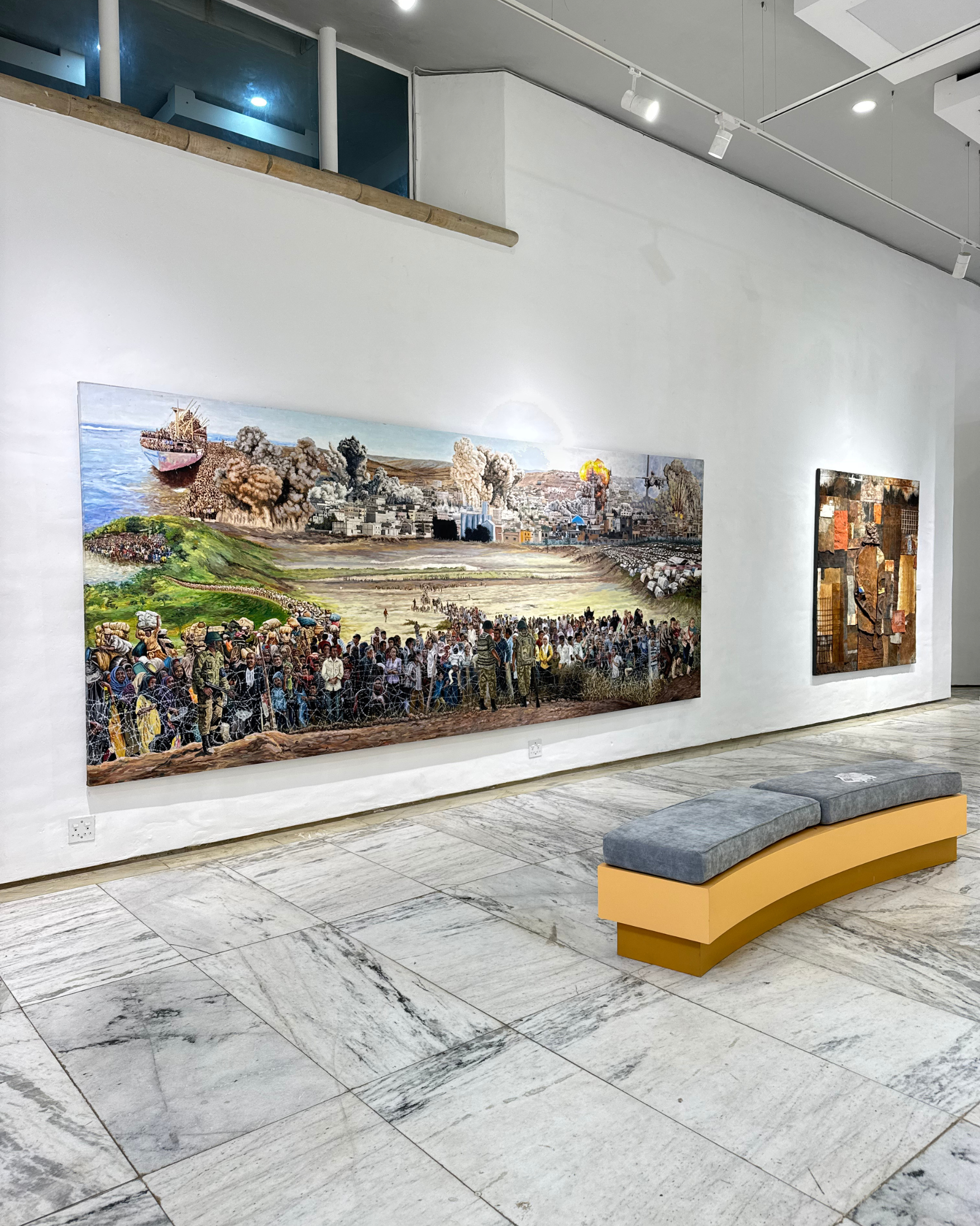 An unexpected irony emerged during preparations for its exhibition: Peace, an artwork depicting people held in uncertainty “between borders,” became delayed in its own transit. Its detention echoed the very themes Malulu addresses — movement, obstruction, and the systems that shape who or what is allowed to pass.