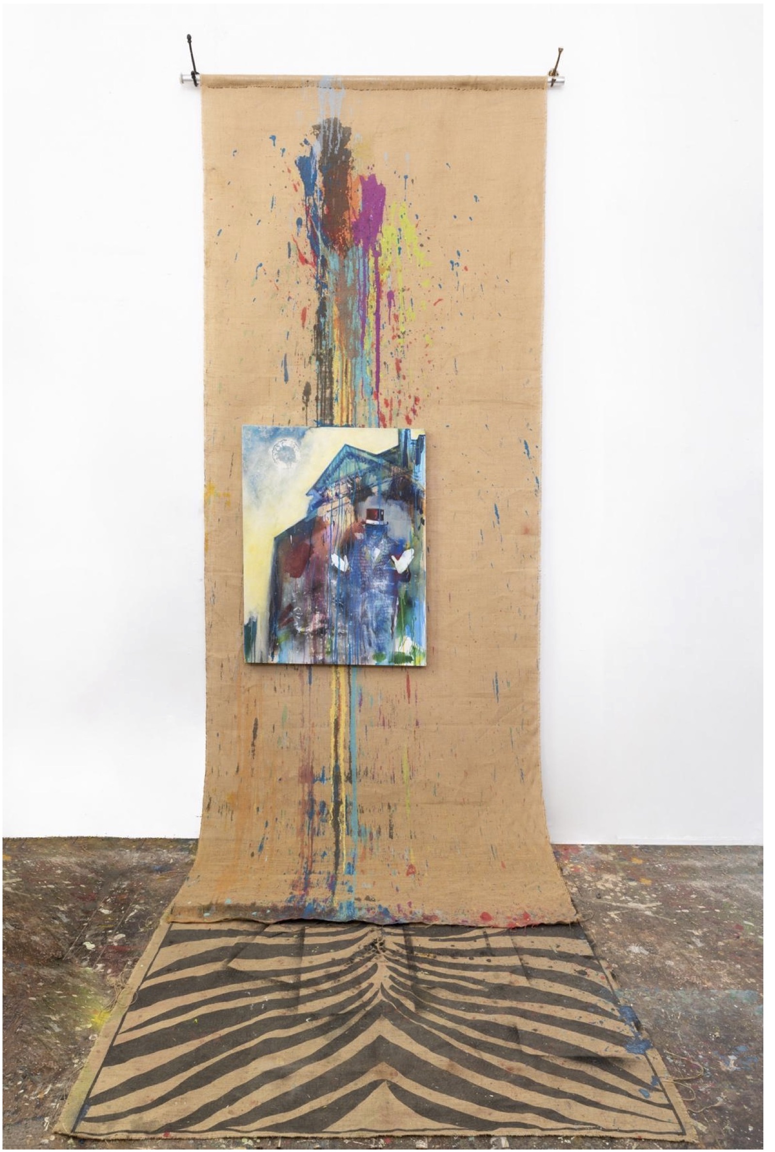 Fantastical Disappearing Act, 2022. Mixed media installation, oil, spray paint, oil bar, ink, acrylic, hessian, screen-printed hessian, found pole and brass hooks. Dimensions variable. Photo credit, Paris Brummer.