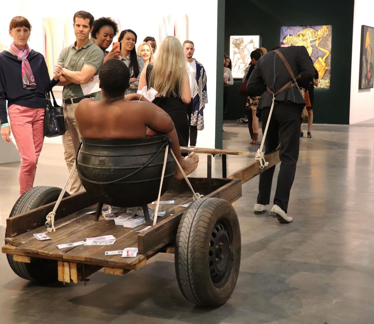 The performance forced questions the fair's spatial organization sought to suppress: What bodies belong in this space? What forms of labour are visible and valued? How do black and white bodies relate to art—as makers, as subjects, as labour, as spectacle? Sibeko in the pot throwing monopoly money, carried on Skinner back recalled histories of forced labour, of bodies reduced to their capacity to carry, to serve, to produce value for others. The donkey cart moving through aisles of expensive artworks created what Moten might call "the scene of subjection"—making visible the continued operation of colonial logics within contemporary cultural economies.