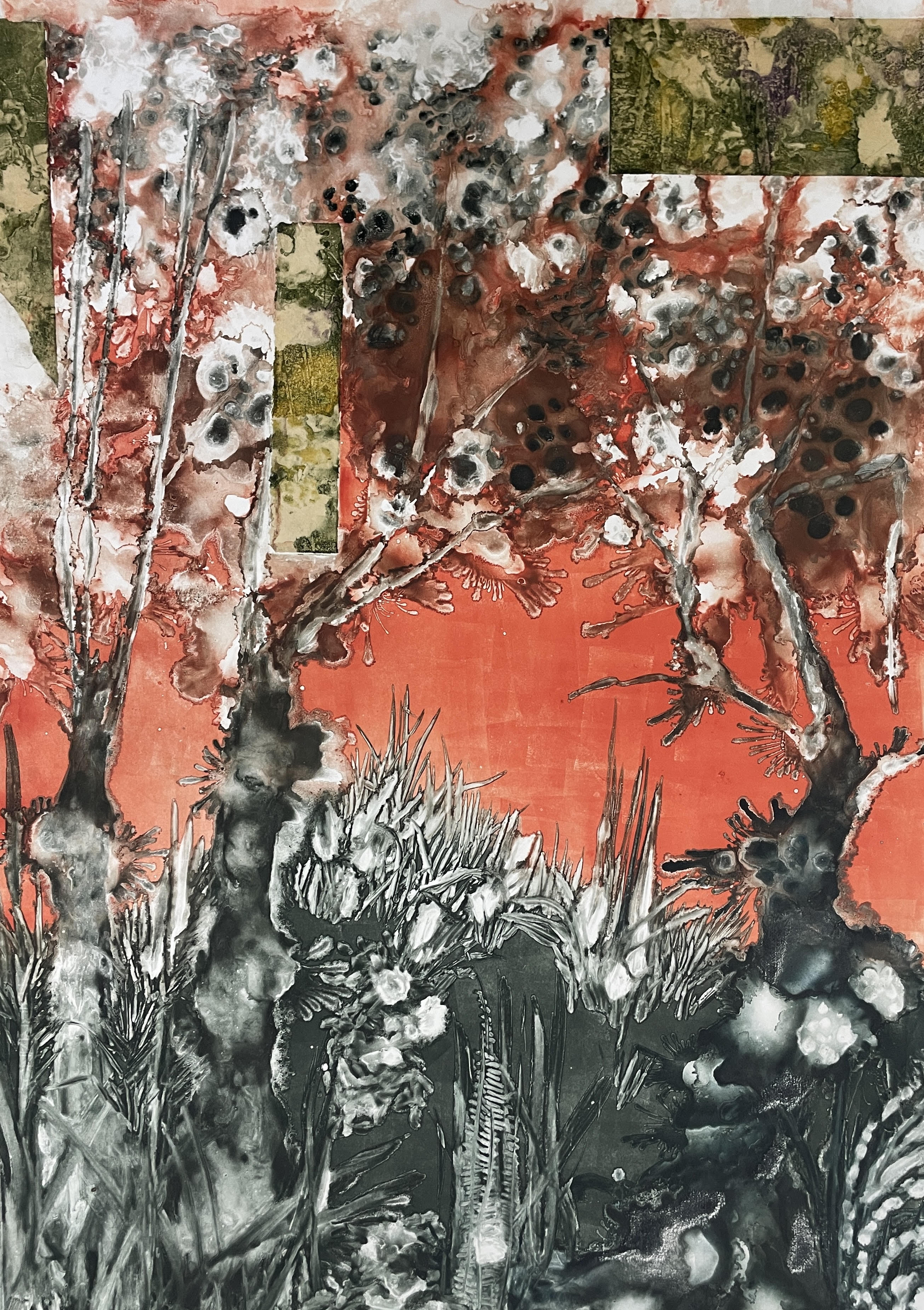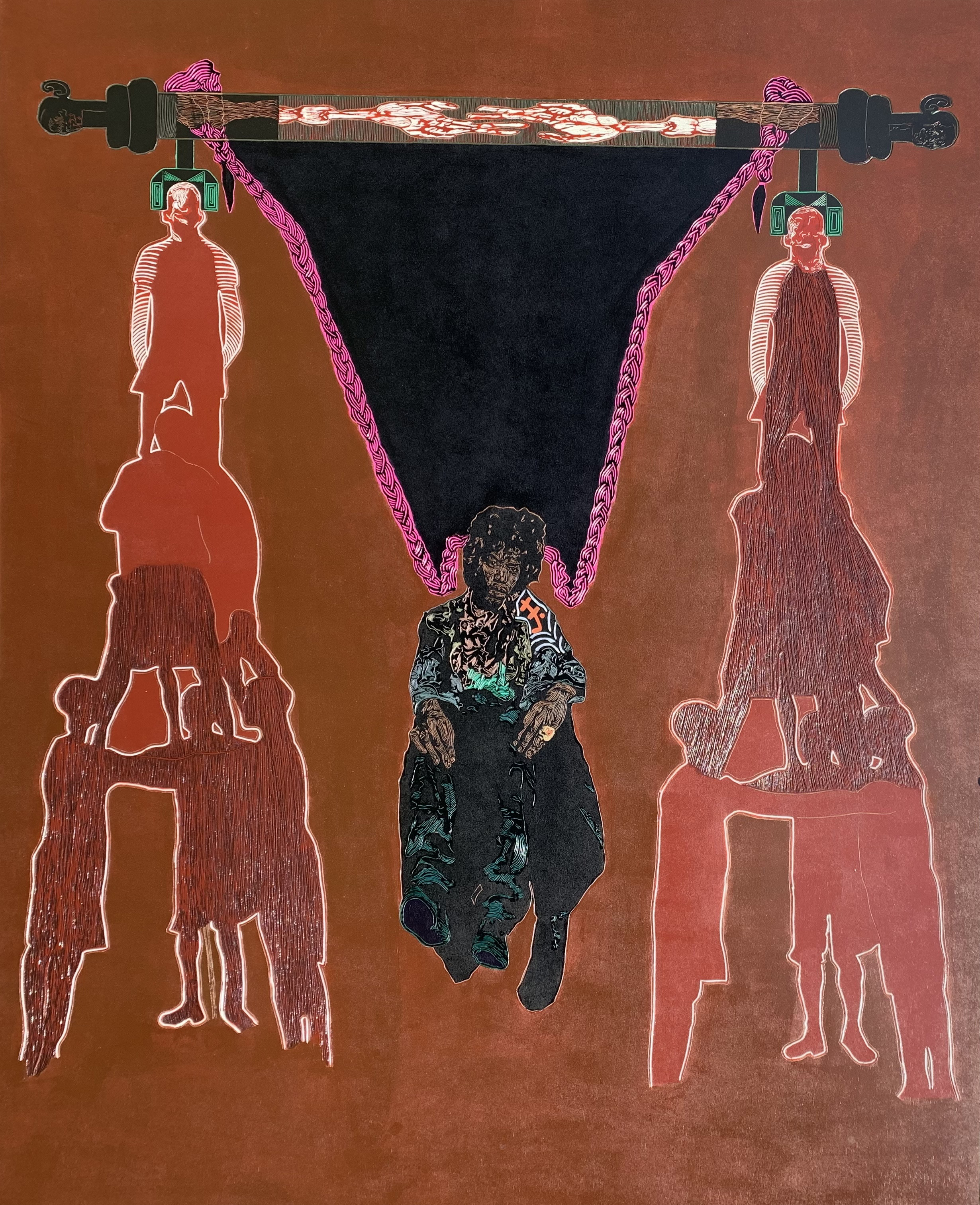 The Ludic Turn, as it unfolds here, is not an abstract idea but a lived repertoire enacted across multiple practices. In this exhibition, play appears in dream, in metamorphosis, in street encounter, and in ostentatious display. Treasure Mlima’s carved prints, Ukunyathela Ngabantwana and Held By Dreams, extend play into a cosmological register, where fragments of image and symbol are recombined into worlds neither confrontational nor compliant but insistently African. In Kheonah Nyebe’s New Growth, New Selves, play becomes metamorphosis: a tender, provisional state in which identity, like pastel dust, is smudged, layered, and always in the process of becoming.