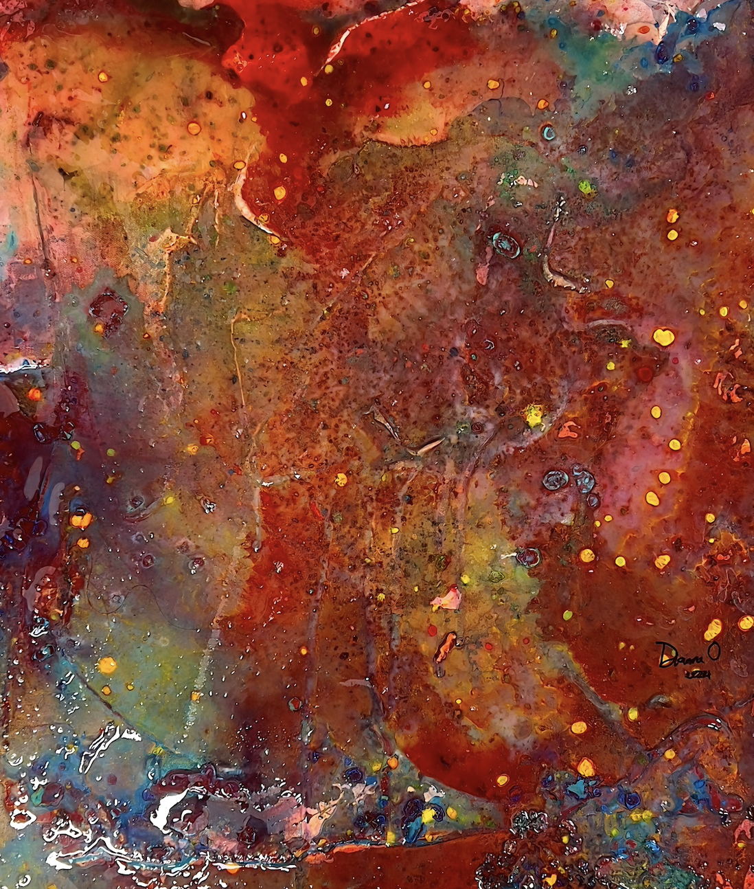 While visiting emerging artist Timilehin Oludare’s studio, I discovered his multidisciplinary practice spanning sound, scent, and visual mediums. Inspired by his Nigerian upbringing, Oludare explores surrealism, conformity, escapism, and play. His use of red in his surrealist mixed media works is both symbolic and evocative, serving as a visceral reflection of the emotional and psychological toll of living within the complexities of Nigeria. He uses line drawing to speak to themes of death and decay, employing symbols such as birds and moonlight. These motifs offered valuable insights into the transitions within Nigerian society, highlighting what may be both ending and beginning.