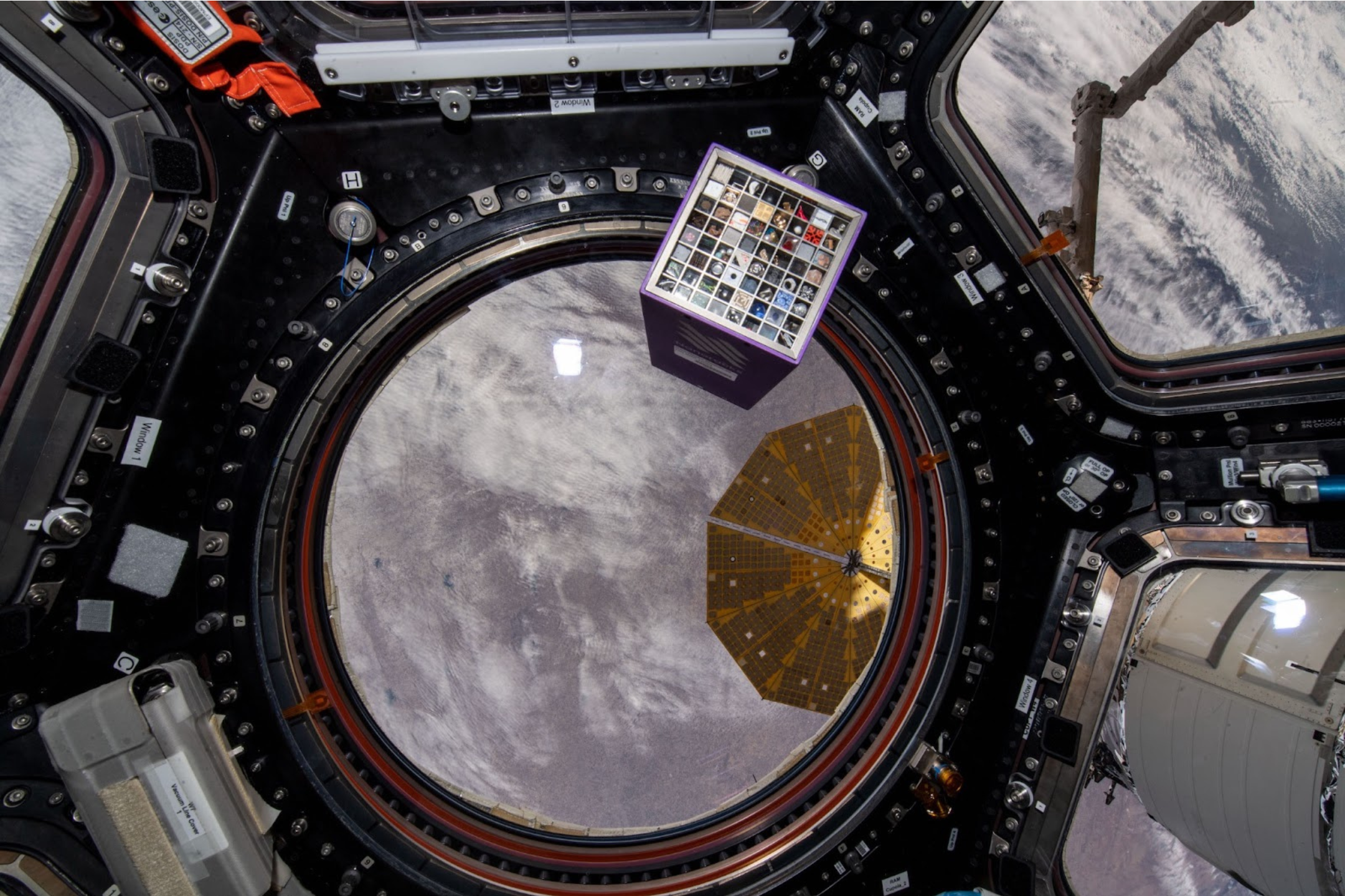 Lead the way again, engraving and microscopic map drawing on acrylic, 2022, 10x10x10mm, on board the International Space Station with The Moon Gallery.