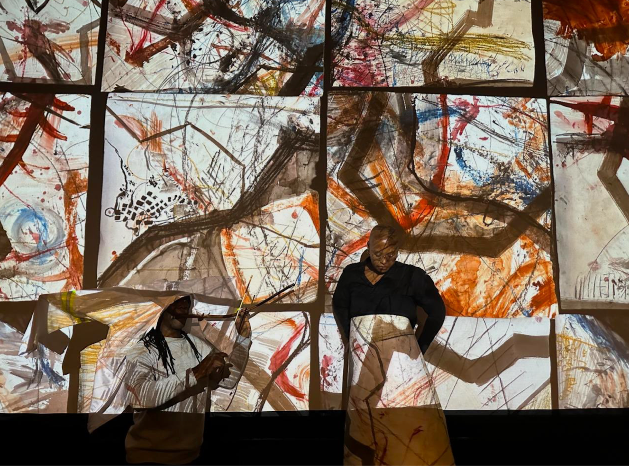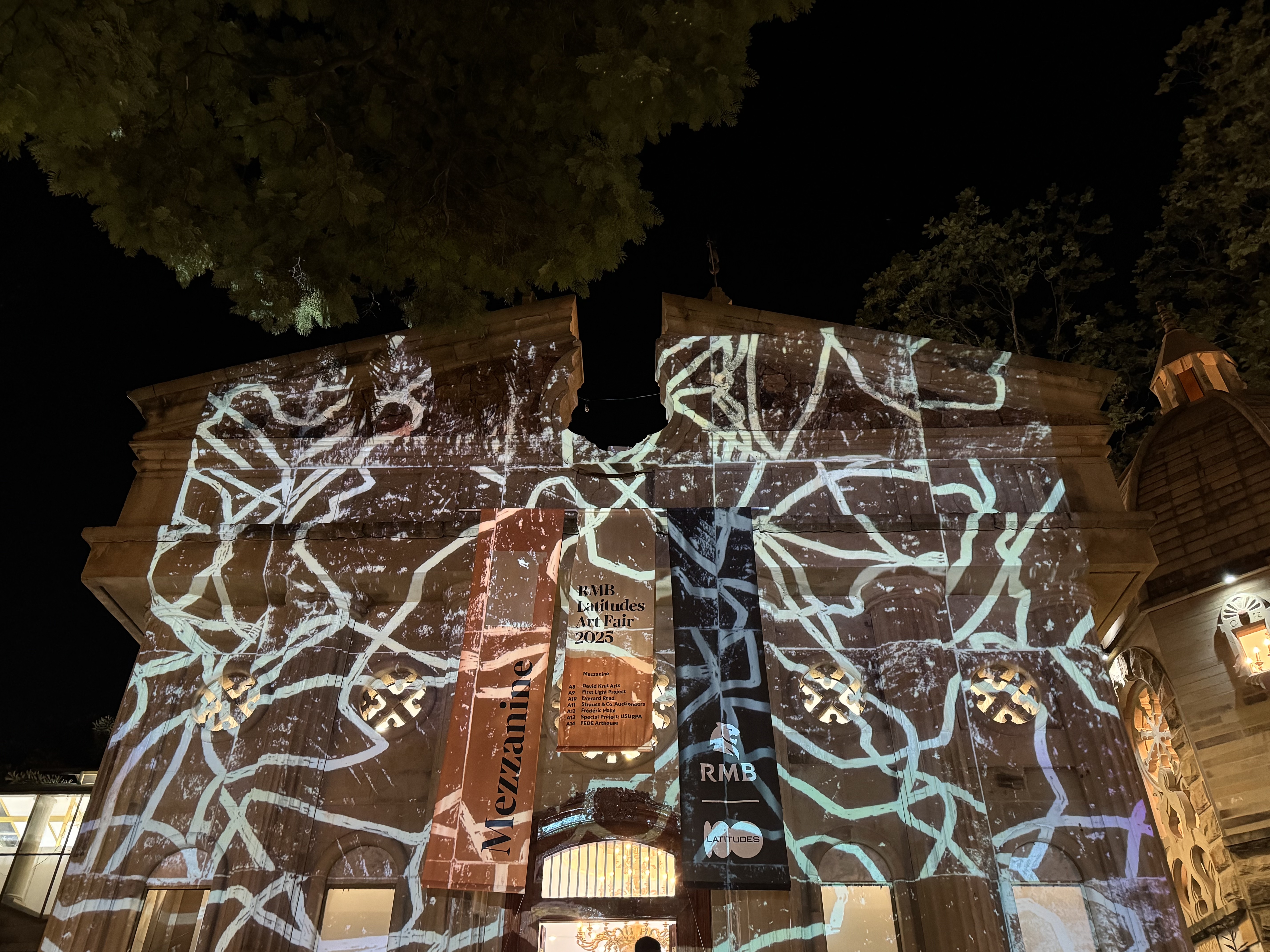 Image on right: Marcus Neustetter, live drawing and building projection at RMB Latitudes 2025, photo by Chelsea Selvan