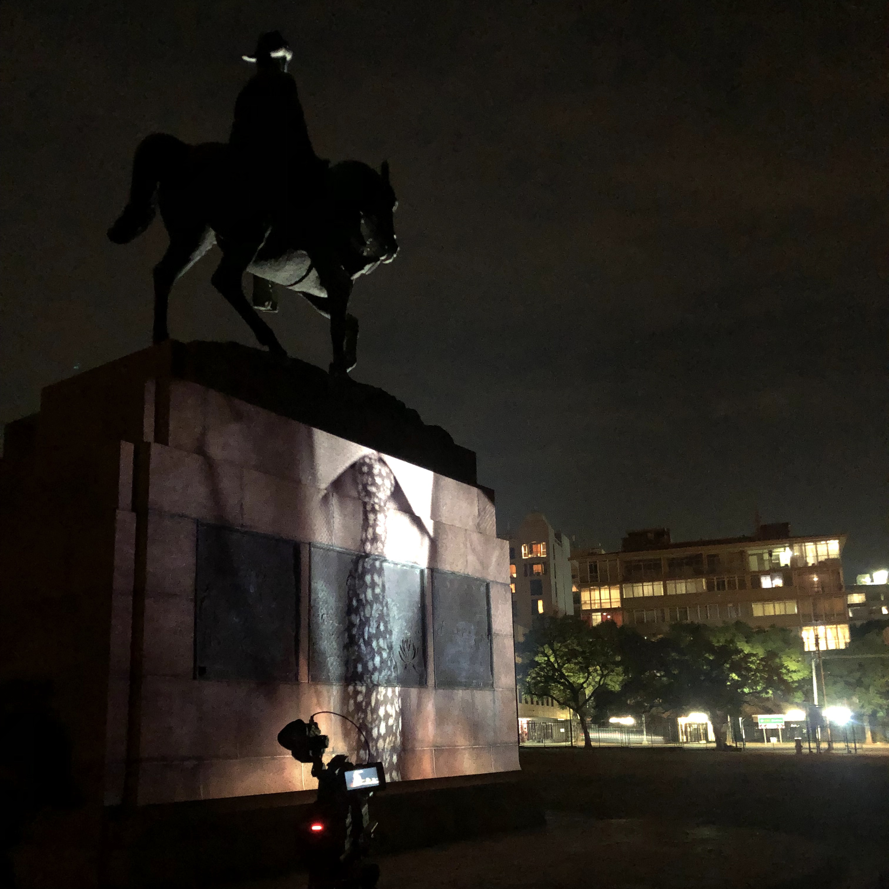 Photograph of a video work, titled Remember-dismember (2015), projected onto the pedestal of an equestrian monument to General Louis Botha, at the Union Buildings in Pretoria