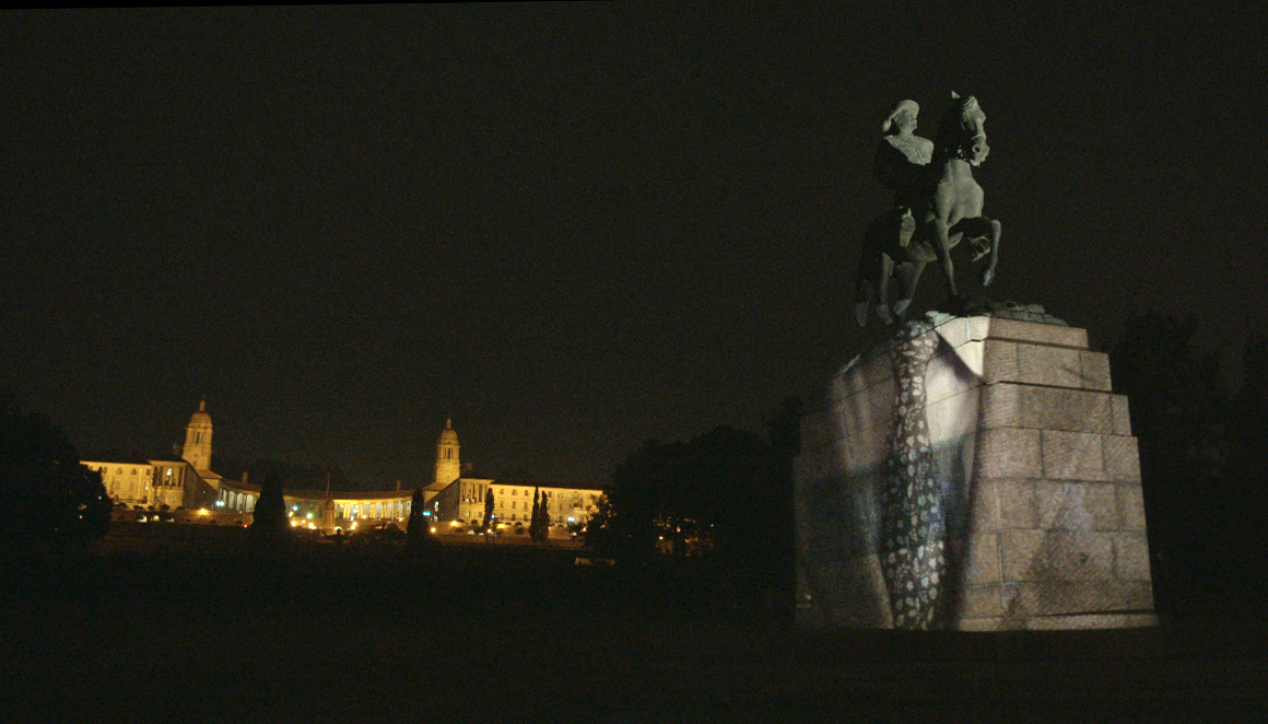 Artwork above: Photograph of a video work, titled Remember-dismember (2015), projected onto the pedestal of an equestrian monument to General Louis Botha, at the Union Buildings in Pretoria