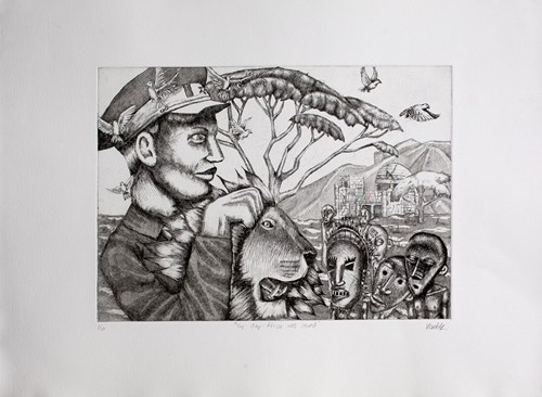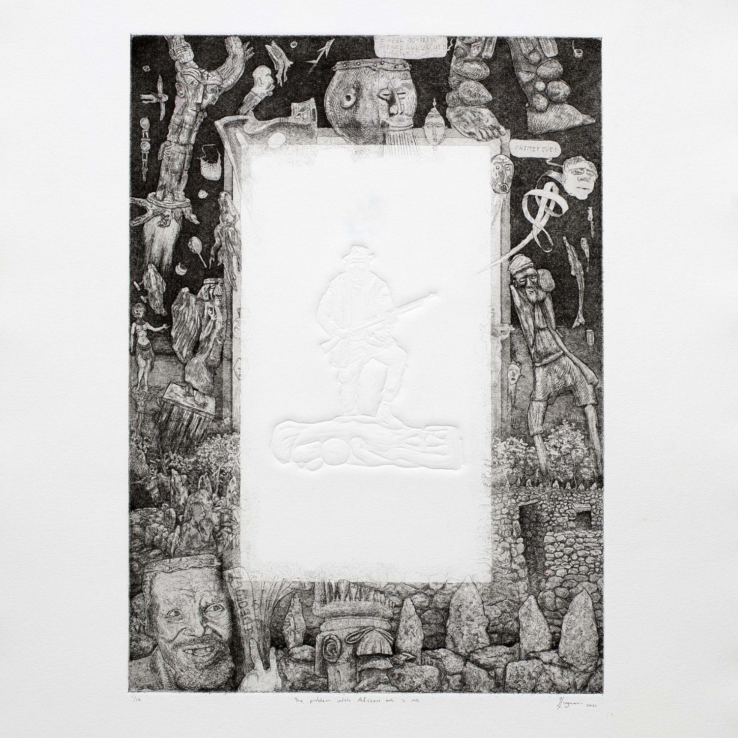 Johan Stegmann, The Problem with African Art is me, 2021, Etching and blind emboss on Hahnemuhle, Edition 1/10, Paper size: 39 x 53.5 cm, Image size: 35 x 25 cm